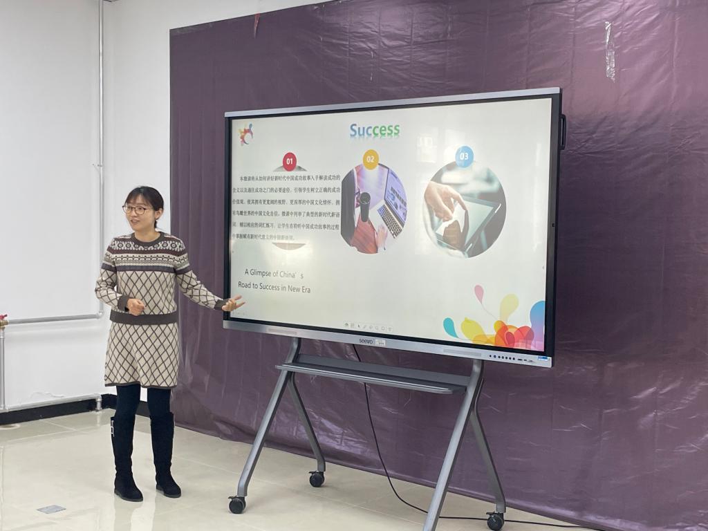 活动以“重点分享+广泛讨论”的形式开展。 教研会上,在河北省2021年度教师公司产品信息化交流活动中获得二等奖的教师代表赵楠楠、朱洁两位教师进行了微课作品制作及参赛经验的分享。赵楠楠老师重点分享了获奖作品“Behind the Word "Taikonaut"——Success Road to Starry Universe” 的资料收集、主题选材和后期制作等方面的心得,朱洁老师则就作品“Will AI Take Over”的思政主题挖掘、思政元素融入与语言学习的结合,及后期配音等技术问题进行了经验分享。两位教师不仅分享了微课中信息化手段的使用心得,同时也对教学设计中课程思政元素的挖掘及如何实现思政元素融入与语言学习有效统一等方面的问题新进行分享。